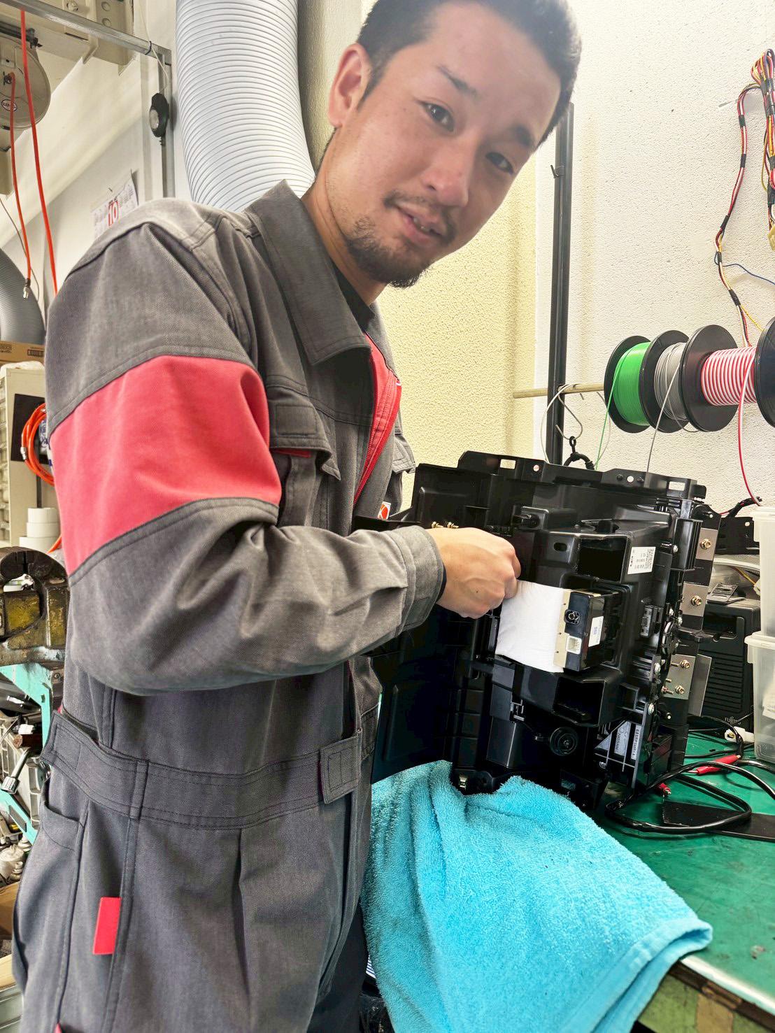タクシーメーターや電装品の取り付け、サービス担当の取りまとめなど、幅広い仕事をしています。この仕事の魅力は、車の知識や技術が身につくこと。そして、お客様から「ありがとう」と言っていただけた瞬間が一番のやりがいです。